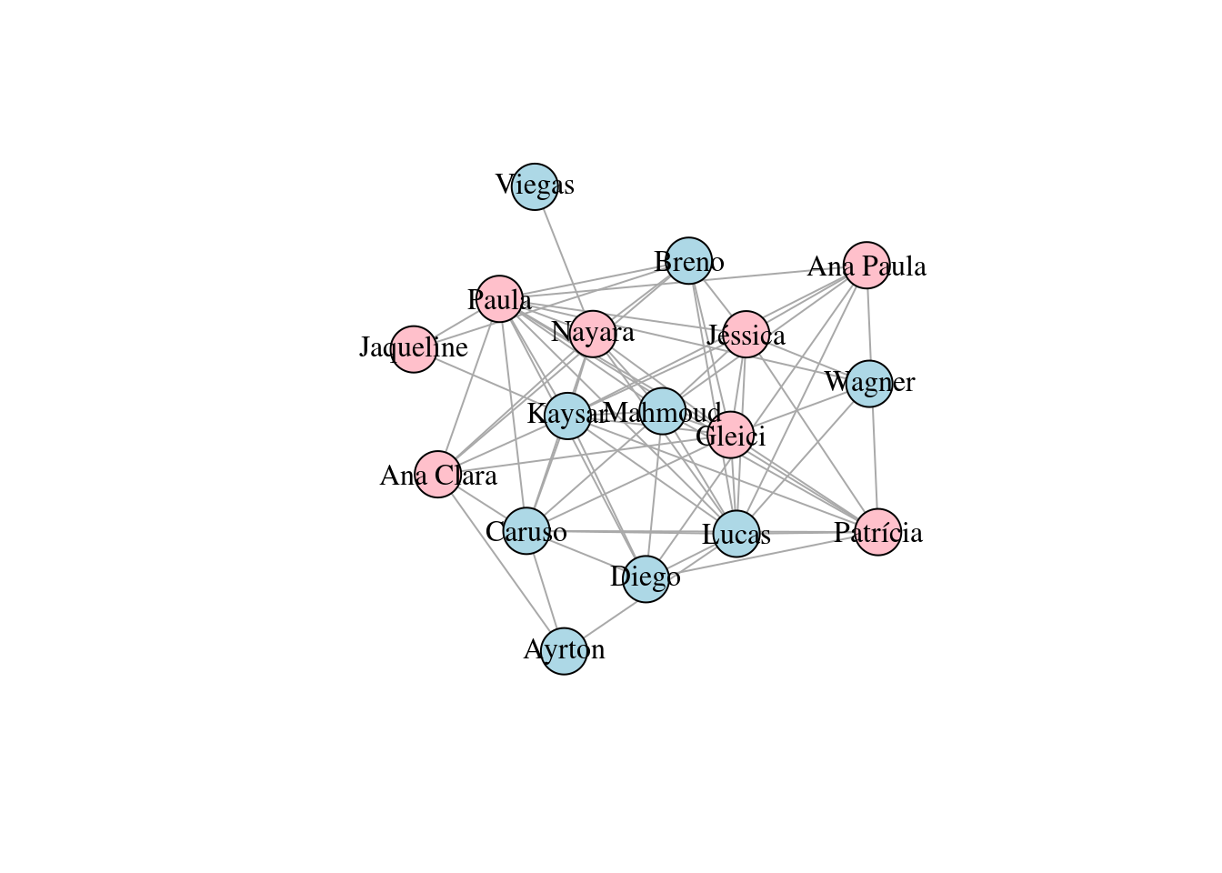 Outra observação é que de fato existem alguns participantes mais importantes na rede, como Paula, Lucas e Patrícia, visto que estão localizados mais ao centro do grafo.