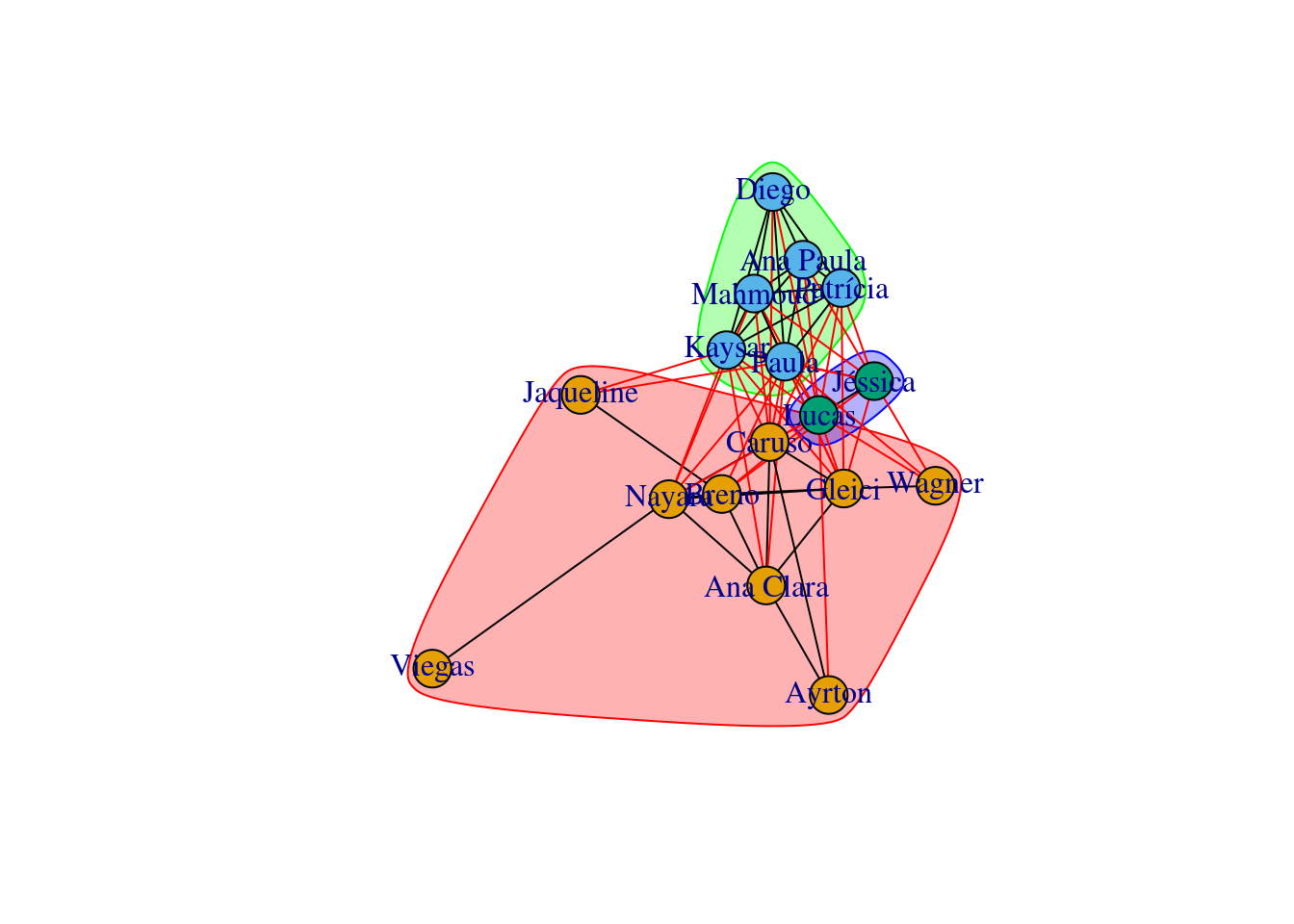 O algoritmno encontrou três comunidades dentro da rede, sendo um deles formados apenas por Jéssica e Lucas.