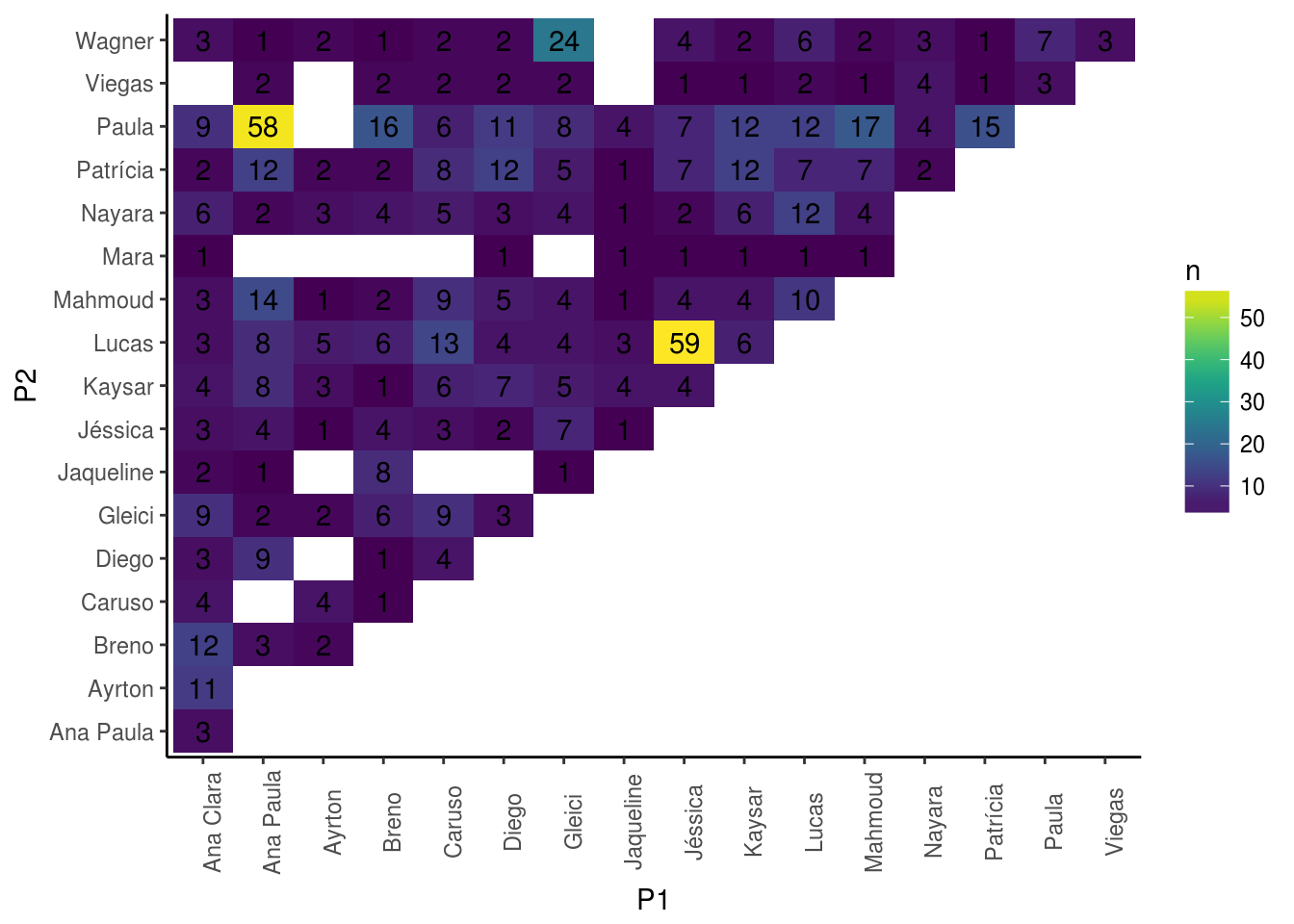 Antes de partir para ARS, vamos ver como se dá a frequência de interações entre os participantes: