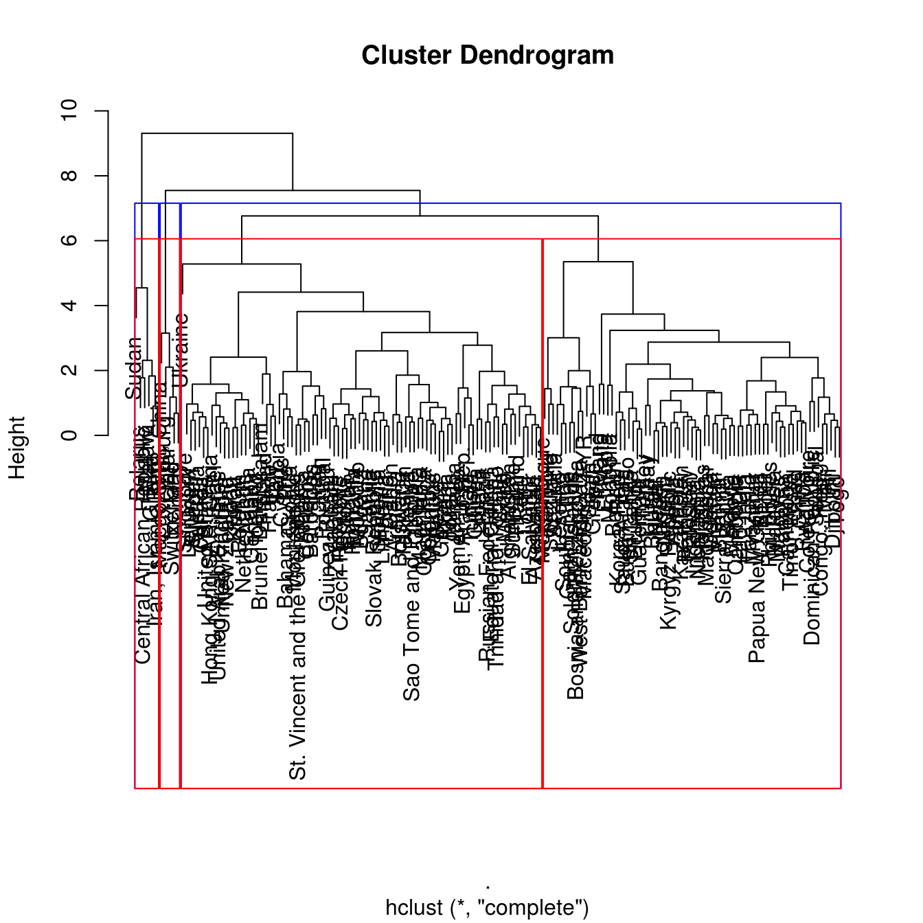 A posição de cada país no dendograma é determinada pela dissimilaridade entre cada um dos outros países. Veja que a opção de 4 segmentos divide um dos segmentos da opção de 3 ao meio. Portanto, 4 parece ser uma boa escolha para a quantidade de clusteres do modelo desta análise.