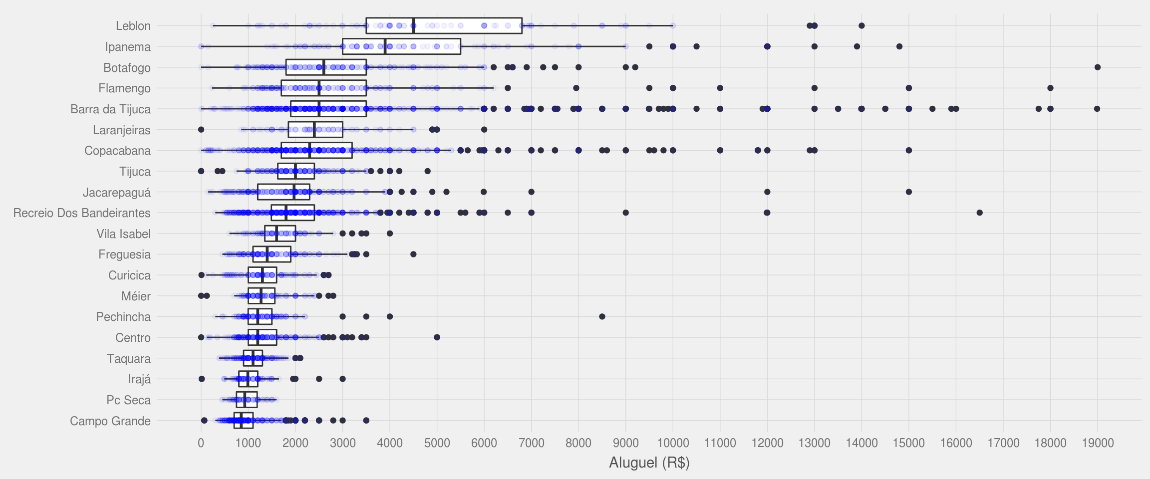 * O aluguel mediano de um apartamento no Leblon é maior que R$4000,00. Contudo, ainda assim é possível encontrar apartamentos cujo valor é o mesmo do mediano encontrado em bairros menos ricos;